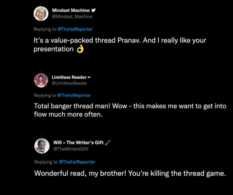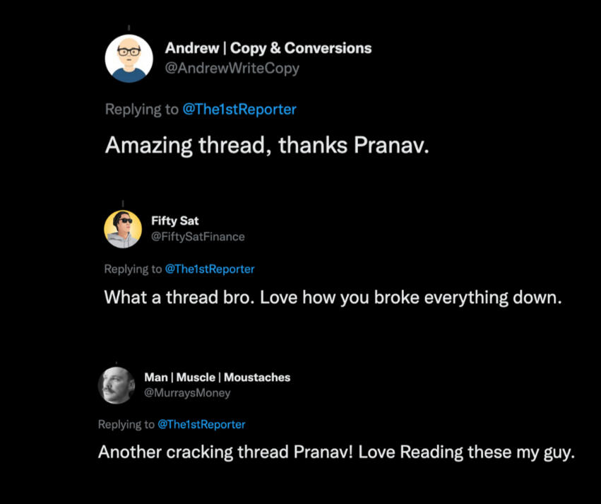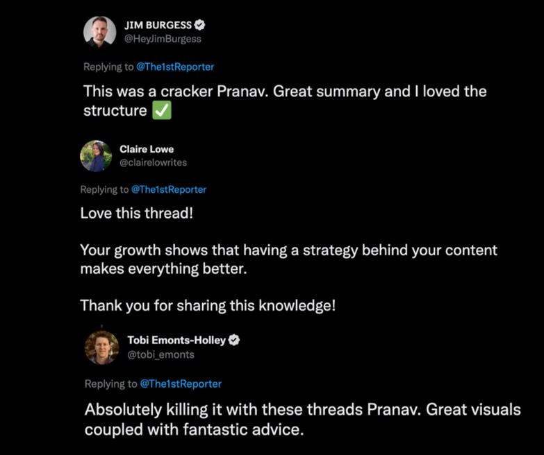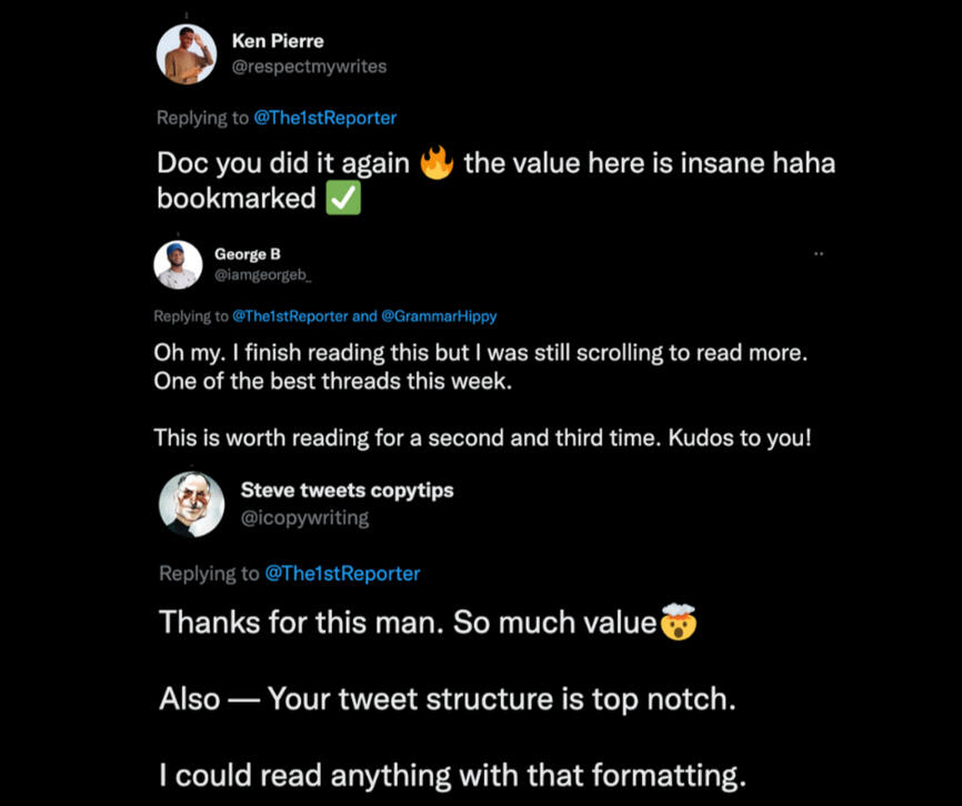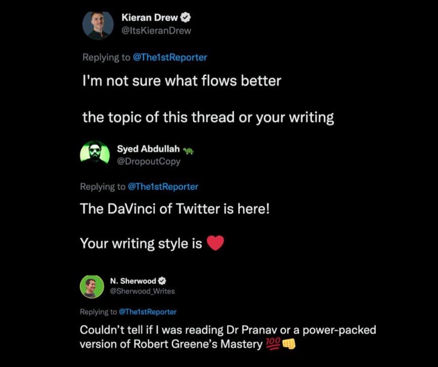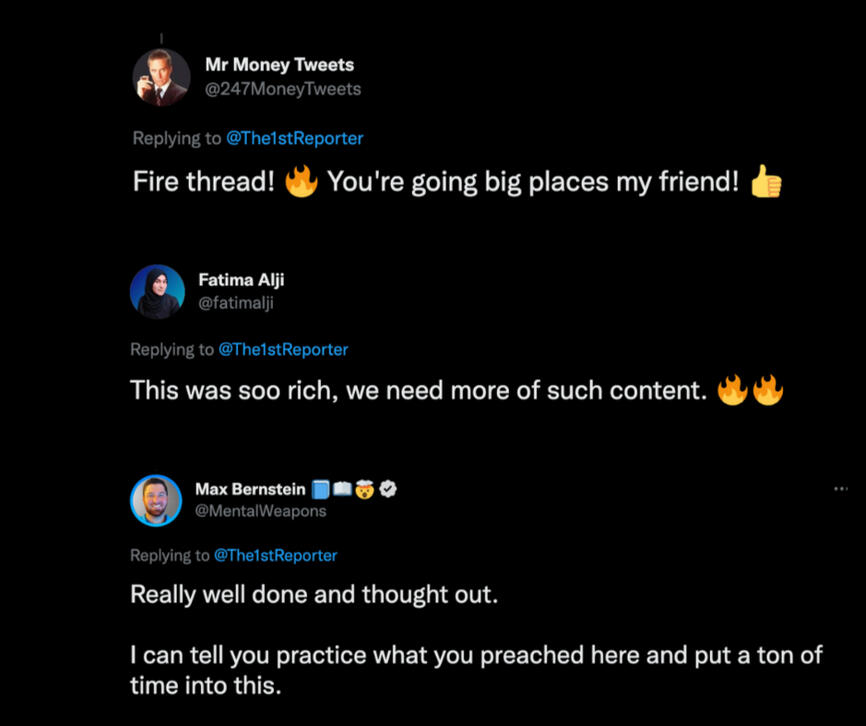 I’ve written for some of the biggest names on the platform, worked with the number one ghostwriting agency on Twitter and published almost 70 threads in 14 months.Here are some of my results and what people are saying: